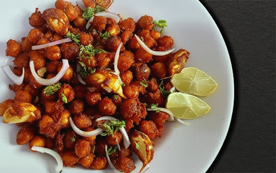 Mumbai-style battered chickpeas or potato strips, deep-fried to a fiery golden crisp.
