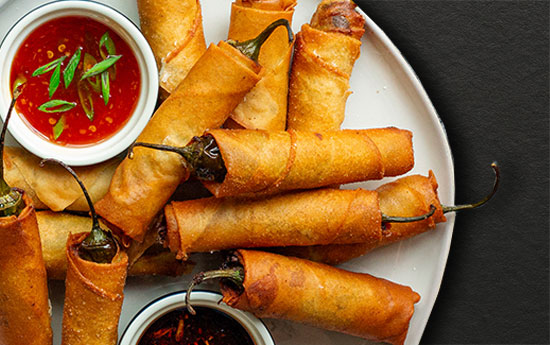 Crunchy rolls packed with seasoned cabbage, carrot, and glass noodles, with sweet chili dip.