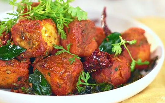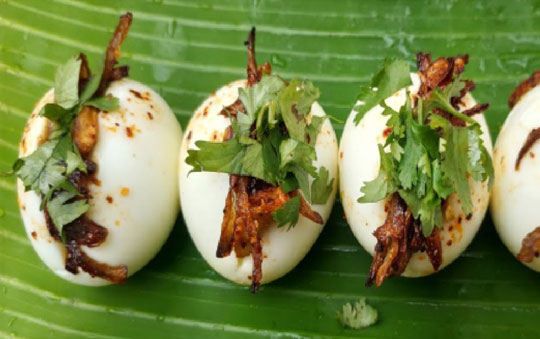 Mini egg halves marinated in Chettinad “65” spice mix and deep-fried to perfection.