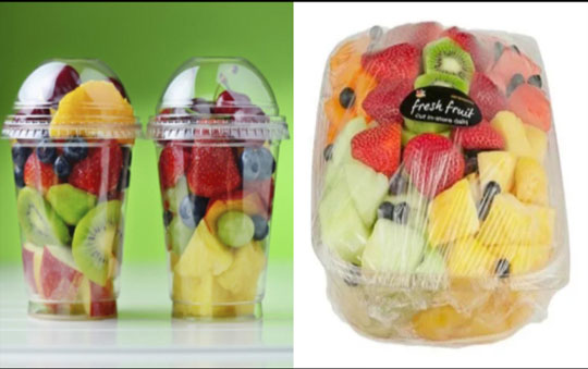 An assortment of seasonal fruits neatly cubed and served chilled.