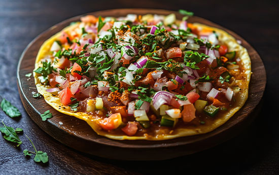 Crisp papadums topped with hearty Punjabi chole, chopped onions, and fresh coriander.