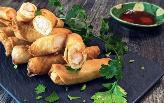 Delicate spring rolls stuffed with marinated shrimp and aromatic spices.
