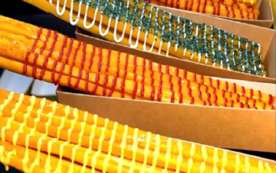Shredded egg fritter sticks, deep-fried until crunchy and served with a tangy dip.
