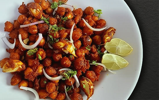 Bombay-style chicken bites tossed in ginger-garlic batter, deep-fried for a crisp, fiery bite.