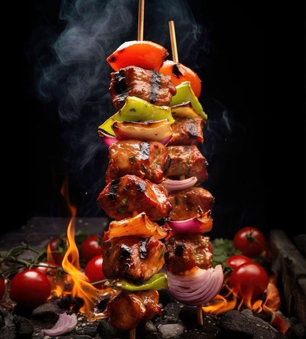 Mixed veggie kebabs seasoned with Uzbek spice blend, skewered and charcoal-grilled.