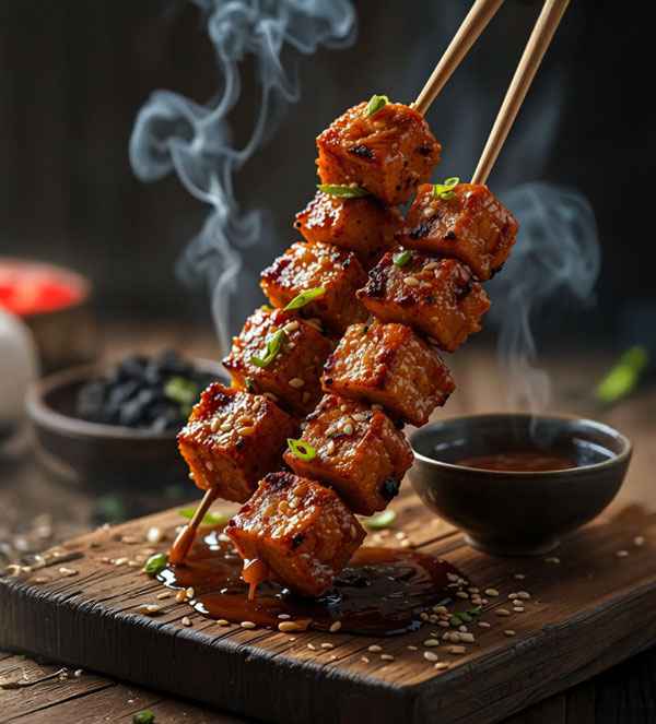 Veggie-filled sushi rice cubes glazed with smoky BBQ sauce on playful skewers.